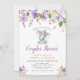 um design floral com flores roxas pintadas de cor d'água e um elefante bebê. O texto e as cores podem ser personalizados.