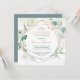 Convite para chás de casais modernos, com uma estrutura geométrica rodeada por folhas de eucalipto e verde com uma dica de azul. Dentro são os detalhes de seu evento em verde escuro junto com o título e os nomes do casal em tom de ouro elegante, sobre uma lavagem a aquarela pastel com manchas de brilho de ouro falso. A parte de trás é uma sombra correspondente de verde azul macio. Este simples e rústico convite é excelente para um chá de casais de temas botânicos.