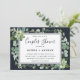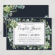 Este convite para chás apresenta cores d'água suculentas, eucalipto e folhas verdes botânicas pintadas com uma estrutura retangular em fundo azul marinho da meia-noite. Itens correspondentes também estão disponíveis.
