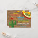 Convite para chás de casamento divertidos feito em um tema colorido mexicano, com um fundo de madeira marrom e gráficos de um cacto de desenho animado vestindo um sombrero e um desenho animado sombrero, no topo. O texto multicolorido é totalmente personalizável e pronto para personalizar o seu evento.
