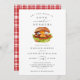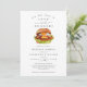 Cartão de convite de chá de casamento bonito com ilustração aquosa de um hambúrguer de ovo frito. O texto diz "tudo que você precisa é de amor e hambúrgueres."