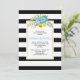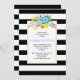 Bonito convite para o chá do casal de casamento floral moderno e chic, com lindas flores e folhas azuis e amarelas aqua, uma fronteira feita de listras brancas e pretas e seu texto em uma moldura branca. O dorso está coberto com um padrão listrado em preto e branco.