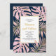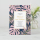 Folhas tropicais cor-de-rosa e ouro e convite para chá de casal azul-marinho. Apresenta folhas de Split Leaf Philodendron (Monstera deliciosa) ou de Queijo Suíço e folhas de palma cor-de-rosa com contorno de ouro em azul-marinho. A sua redação está num quadro branco com contorno dourado. O verso inclui um padrão de bolinhas de ouro e marinho.
