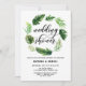 Convite de chá de casamento tropical com camada de aquarela e padrão de folhas de palma, folhas de bananas e outras folhas tropicais. Este convite para chás de casamento tropicais é perfeito para casamentos de verão e praia. Personalize adicionando nomes, data, hora, local e outros detalhes do evento.
