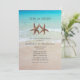 Convites para chás de casamento de areia e mar. Dois estrelas representam o casal de uma festa Jack e Jill. A água turquesa e as ondas à costa são a imagem tropical, de fundo para o texto preto impresso. Os cantos entalhados podem ser alterados e atualizações de papel estão disponíveis.