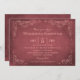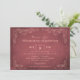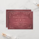 Este cartão de convite formal para chás de casamento com estilo de etiqueta de vinho avintage design. Esboços de folhas de videira feitos à mão, feitos à mão, enquadram os detalhes importantes. Um simples design florescido com a data do evento aparece no lado oposto. Esquema de cor vermelho escuro e rosa esbranquiçado.