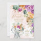 Um doce pequeno amendoim está a caminho! Celebre a chegada da sua pequena selvagem com este belo convite de chá de fraldas apresentando ilustração adorável de um doce elefante bebê, verde tropical exuberante e flores laranja e roxo lindas.