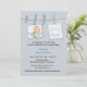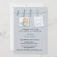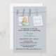 Uma linha de tecido azul com um bebê sentado num guarda-chuva e o texto 'é um rapaz' em quadros de fotos pendurados na linha de malha. O fundo é uma sutil faixa azul.