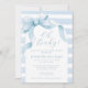 Celebre a chegada do seu pequeno com o nosso belo convite de chá simples e elegante para o bebê. Apresentando fita azul-clara de arco no arco da boêmia e um padrão listrado de cor d'água fofo no verso, este convite define o tom perfeito para uma doce celebração de chá de fraldas de pré-disquete.
