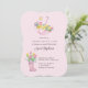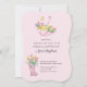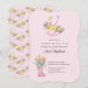 Um convite de chá de fraldas branco cor-de-rosa para chá de fraldas de menina ou uma futura mãe feminina. O design apresenta um guarda-chuva rosa e solários cor-de-rosa, cheios de flores de primavera, incluindo narcisos e tulipas. Doce design e perfeito para um chá de fraldas Primavera.