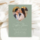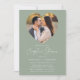 Convite simples para o chá com a foto do seu noivado aninhada dentro de um quadro em forma de coração em um fundo verde de sábio. Personalize o chá de fotos com seus nomes e detalhes do chá mostrados abaixo em letras brancas com "Chá" exibido em um script manuscrito.