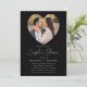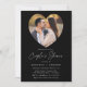 Convite simples para o chá com a foto do seu noivado aninhada dentro de um quadro em forma de coração sobre um fundo preto. Personalize o chá de fotos com seus nomes e detalhes do chá mostrados abaixo em letras brancas com "Chá" exibido em um script manuscrito.