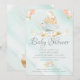 Um convite para chás de fraldas de aquarela bonito apresenta um bebê fada na parte de trás de um pássaro azul.