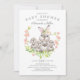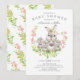 Design de chá de fraldas bonito com bezerros tripletos de mãe e bebê com um delicado laurel de flor rosa. Sacudir o nosso convite para ver uma floral coordenada de volta para um toque especial extra. Visite o nosso compro para ver este design para um chá de fraldas de rapazes, raparigas e gêmeos.