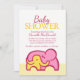 O chá de fraldas bonito convida para o amarelo, o rosa e o branco, com dois elefantes giros abraçando um bebê e um pai. Personalize com seus detalhes de chá de fraldas. Ilustração exclusiva e design por Sarah Trett para www.mylittleeden.com