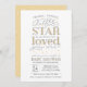 Este belo convite para o chá de fraldas apresenta uma poeira de estrelas e a frase "brilha, brilha, estrela pequena, você sabe o quanto você é amado" em amarelo e cinza - faz um excelente de chá neutro!