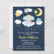 Este convite bonito e caprichoso mostra um adorável elefante bebê em uma coroa dourada sentada em uma nuvem com estrelas caindo. Ao fundo está um céu noturno estrelado e lua crescente. O texto combina o script manuscrito e as fontes sans serif para uma aparência na moda e moderna. Isto é perfeito para um chá de fraldas.