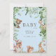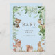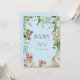 Convite de Chá de fraldas azul. Rapaz. Animais. Informação na frente e no verso. Folhagem.
