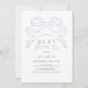 Este convite de chá de fraldas de coquetel e bonitinho apresenta um arco/fita azul desenhado manualmente. O verso apresenta um fundo branco com xadrezes/verificações de gingham azuis. Personalize-o para as suas necessidades. Você pode encontrar produtos correspondentes na minha loja.
