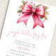 Jingle Bells Bebê Dedos Rosa Arco Chá de fraldas de Natal. Estilo minimalista com um script não editável definido para Jingle Bells Tiny Toes e personalize facilmente o resto do texto para seus detalhes. Um arco cor-de-rosa coquetel com sacola e bagas adiciona um toque festivo especial.