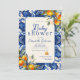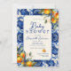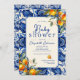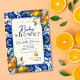 Celebrar as mamães a serem com esses azulejos azuis mediterrânicos e laranjas inspiradas em na moda. Este azulejo Azul Vintage e laranjas, pequeno Convite para Chás de fraldas fofos pode ser personalizado com seus próprios detalhes. O design apresenta um fundo de azulejo azul vintage com trabalho de arte de laranjas realísticas.
