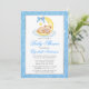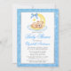 Urso de Pau-Água na Lua e nuvens com Convite ao Chá de fraldas de arco Azul. Moldura Azul. Texto Prateado e Azul.