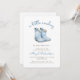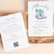 Este chá de fraldas bonito apresenta uma ilustração aquosa de um par de botas de cowboy azuis. Acima de tudo, as palavras "um pequeno cowboy" aparecem em um roteiro azul de tendências. Personalize o texto com o nome da futura mãe em escrita azul e os detalhes em fontes de sans serif castanhas. O verso oferece espaço para fralda, livros para bebê e detalhes do registro, juntamente com um conveniente código QR que os convidados podem digitalizar para visitar o registro. Ideal para o chá de fraldas de um menino.
