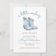 Este chá de fraldas bonito apresenta uma ilustração aquosa de um par de botas de cowboy azuis. Acima de tudo, as palavras "um pequeno cowboy" aparecem em um roteiro azul de tendências. Personalize o texto com o nome da futura mãe em escrita azul e os detalhes em fontes de sans serif castanhas. A parte de trás da placa apresenta um padrão de estrelas desenhadas à mão em branco sobre um fundo azul. Ideal para o chá de fraldas de um menino.
