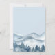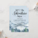 Que a aventura comece o temático convite do chá de fraldas azul de aquarela com florestas e montanhas paisagem selvagem com tipografia de escrita de caligrafia com coração no meio. Consulte o cheio de produtos para este design em: https://www.zazzle.com/collections/forest_adventure_baby_shower-119311648144421112