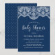 Convide seu convidado para o seu evento com este convite personalizável para chás de fraldas. Apresenta um rendas botânico branco de brocade sobre um fundo azul marinho. Personalize este convite de chá de fraldas elegante adicionando nomes, data, hora, local e outros detalhes. Este convite elegante é perfeito para qualquer tema de chás de fraldas.