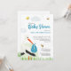 Um chá de fraldas de convite de modelo de menino bonito e personalizável, com uma cegonha puxada pela mão com abelhas e borboletas em um campo. Uma cegonha azul faz uma entrega especial de um bebê. Celebrar a chegada iminente do novo bebê com este cartão de convite para o bebê de cegonha giro. Personalize o convite com seu texto e informações.