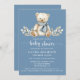 Celebrar a chegada de um bebê de inverno com este charmoso convite que apresenta um adorável ursinho de peluche aquoso vestindo um cachecol acolchoado e aninhado entre a folhagem festiva de inverno, como a baga sagrada e gelada. O convite é dirigido contra um belo fundo azul empoeirado. Esta design inspirada no feriado captura perfeitamente a magia da estação de inverno. É uma escolha encantadora para esperar que os pais hospedem um inverno, feriado ou chá de fraldas de Natal. A letra elegante do script adiciona um toque de sofisticação, fazer ideal para um evento chic, memorável. Personalize facilmente todos os detalhes da festa.