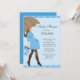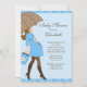 Comece o seu chá de fraldas de bebê com o nosso convite de Chá de fraldas moderno e moderno com uma mãe grávida na moda segurando um guarda-chuva de bolinhas azul e castanho e sacos de compras colocados sobre um fundo de bolinhas azul de bebê. Um convite bonito para um chá de bebê. Apenas personalize com suas informações e você está pronto para ir! Itens correspondentes, incluindo chás de fraldas postais, adesivos de favoritos, cartões de agradecimento e obrigado que você também está disponível em nosso compro. ©JWI Ilustrações