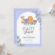 Safari Animal Boy Blue Chá de fraldas Invitation. Cores de água, vegetação botânica com animais da selva, incluindo girafa, elefante, leão e rinoceronte. Um pequeno padrão de elefantes bonito em um fundo azul na parte de trás da placa.