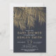 Árvore de palmeira de ouro simples e moderna, com uma tipografia simples, uma festa de tendências e chás de fraldas tropicais nas folhas de palmeiras, em azul marinho escuro.