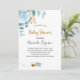 Para um Chá de fraldas, comemorando um menino. Um fundo branco chic. Decorados com um rosa, uma flor, um eucalipto verde floral e cinza de cor azul-clara, folhas, um ouro, e um carregando de abelha feliz e giro e feliz. Personalize e adicione um nome e detalhes da parte. Letras pretas e ouros. O texto: Chá de fraldas e o nome da mãe a ser é escrito com um moderno estilo escrito à mão. Traseiro: cor azul clara do fundo e a abelha feliz sorrindo.