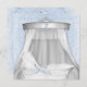 Belo vassoura branco com elegante copa prateada e branca. Elegante e belo convite de chá de bebê branco e azul. Fita azul de ilhotas e fundo azul de rendas apresenta uma fita branca vintage com um arco azul.