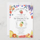 chá de fraldas temático fruta com ilustrações de mirtilo, pera, morango, pêssego, abacaxi, uva, melancia, banana, laranja, maçã e framboesa.