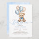 Urso de peluche com balões, convite para chá de fraldas de menino azul.