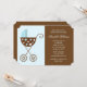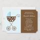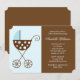 Simples convite para chás de fraldas ou novo anúncio de nascimento ou adoção de bebê apresenta uma bela ilustração vetorial de uma carruagem de bebê ou carrinho em tons de azul e marrom. Cores personalizadas disponíveis por solicitação.