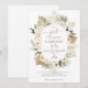 Um convite a chá de fraldas de cor de água, com um estilo bonito de terra, com uma estrutura floral neutra, com cor de água, que apresenta flores de pérolas cremosas com erva de pampas secas e folhas de palmetto em cores cremosas com toques de verde. Uma bonito mistura de script e tipo colorido serif em tons de bronzeado e matizes de pastel de cinza.