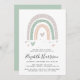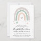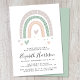 Convite moderno ao chá de fraldas de vassoura com uma abstrato de aquarela de um arco-íris verde-sábio, laranja e lavanda com corações, o nome da mãe num roteiro de na moda e os detalhes do chá em uma simples tipografia.
