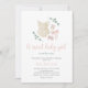 "Uma menina doce está a caminho" Comemore a futura mãe com este convite de chá de fraldas rosa e boêmico verde, pastel, com ilustração de um "baby-romper", calçados, um arco e um brinquedo de bebê de madeira giro cercado por um verde-eucalipto.