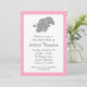 Um convite para chás de fraldas de meninas, com uma ilustração de elefante de cinza giro em um fundo de bolinhas rosa. Gráficos © Scrappin Doodles em www.scrappindoodles.com
