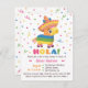 Este convite temático da festa mexicana vem com um asno bonito e colorido do pinata que esteja vestindo um chapéu do sombrero. A palavra "Hola" que não é meios editáveis "olá!" no espanhol. Confetes coloridos dos triângulos e das fitas no fundo. Um design alegre e brilhante que pnha um sorriso sobre a cara do receptor! Personalize facilmente com seus detalhes do partido.