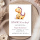 Este chá de fraldas bonito apresenta um dinossauro cor d'água laranja e roxo acima das palavras "RAWR! É um Boy!" em letra de impressão de mão roxa. Personalize o texto com o nome da mãe-para-ser em roxo e os detalhes na fonte serif de cinzas de carvão.