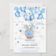 Uma bela arte de chá de fraldas com um elefante bebê com orelhas azuis sentados em uma cesta com balões em cores azul, branca e prateada. Design de balão de ar quente com chá de fraldas adorável com nuvens e estrelas azuis e creme à volta. Personalize alterando o texto e os detalhes.