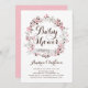 Bonito convite de chá de fraldas de coroa floral rosa. Apresenta uma coroa floral de flores cor-de-rosa e cinzas de primavera com caligrafia moderna e caprichosa. Este convite para chá de fraldas de coroa floral será perfeito para uma chá de fraldas e chás de fraldas de jardim. Personalize adicionando os detalhes do evento.