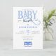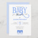 Adorável convite de CHÁ DE FRALDAS azul com uma tipografia azul BABY e pequenas botas azuis.