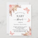 Para um chá de fraldas moderno estilo boho. Um fundo branco na frente. Decorados com ouro rosa e flores, rosas, erva-pampas e borboletas cor-de-rosa. Personalize e adicione um nome e detalhes da parte. Fundo: fundo cor-de-rosa pincelado e borboleta.
